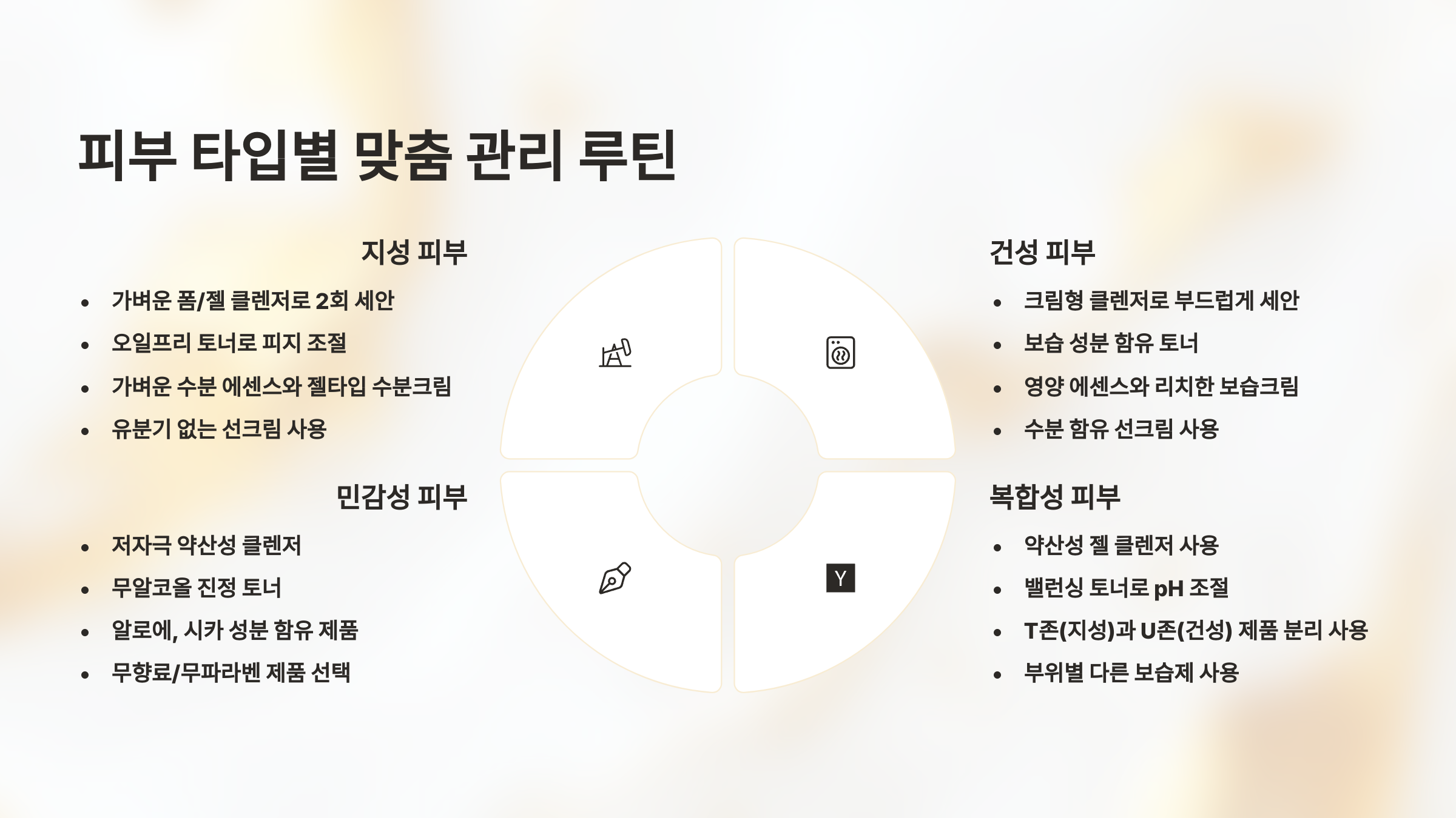 | 민감성 | 순한 세안 → 진정 토너 → 순한 보습 → 물리적 선크림 | 순한 세안 → 진정 토너 → 진정 에센스 → 순한 보습 | 자극 성분 피하기 |