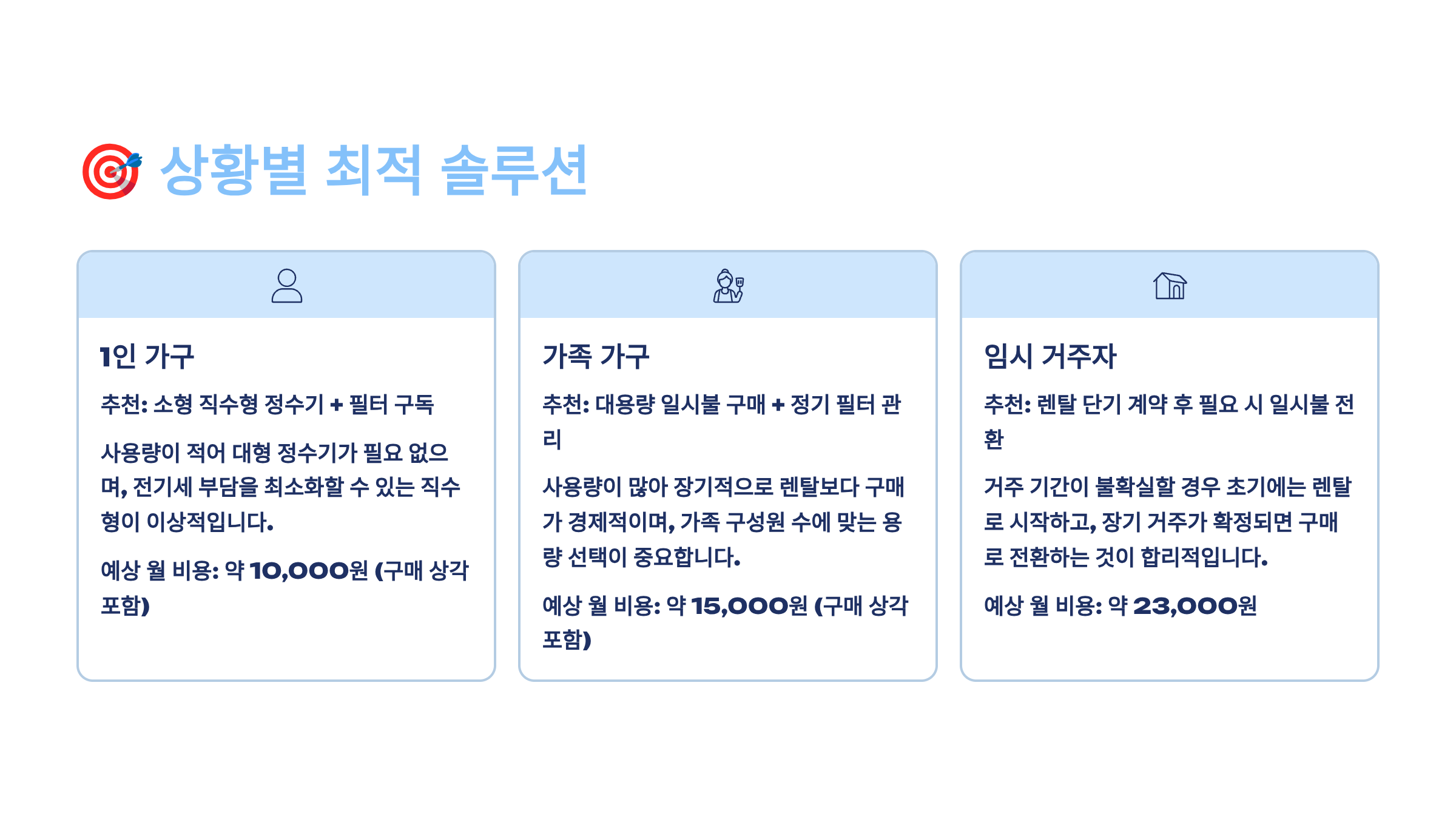모든 가정의 상황이 다르기 때문에 획일적인 해답은 없어요. 가족 구성원 수, 생활 패턴, 예산 등을 고려해서 최적의 솔루션을 찾아야 해요. 지금부터 각 상황별로 가장 효율적인 정수기 선택과 절약 방법을 제안해드릴게요. 여러분의 상황과 가장 비슷한 케이스를 찾아보세요! 🎯