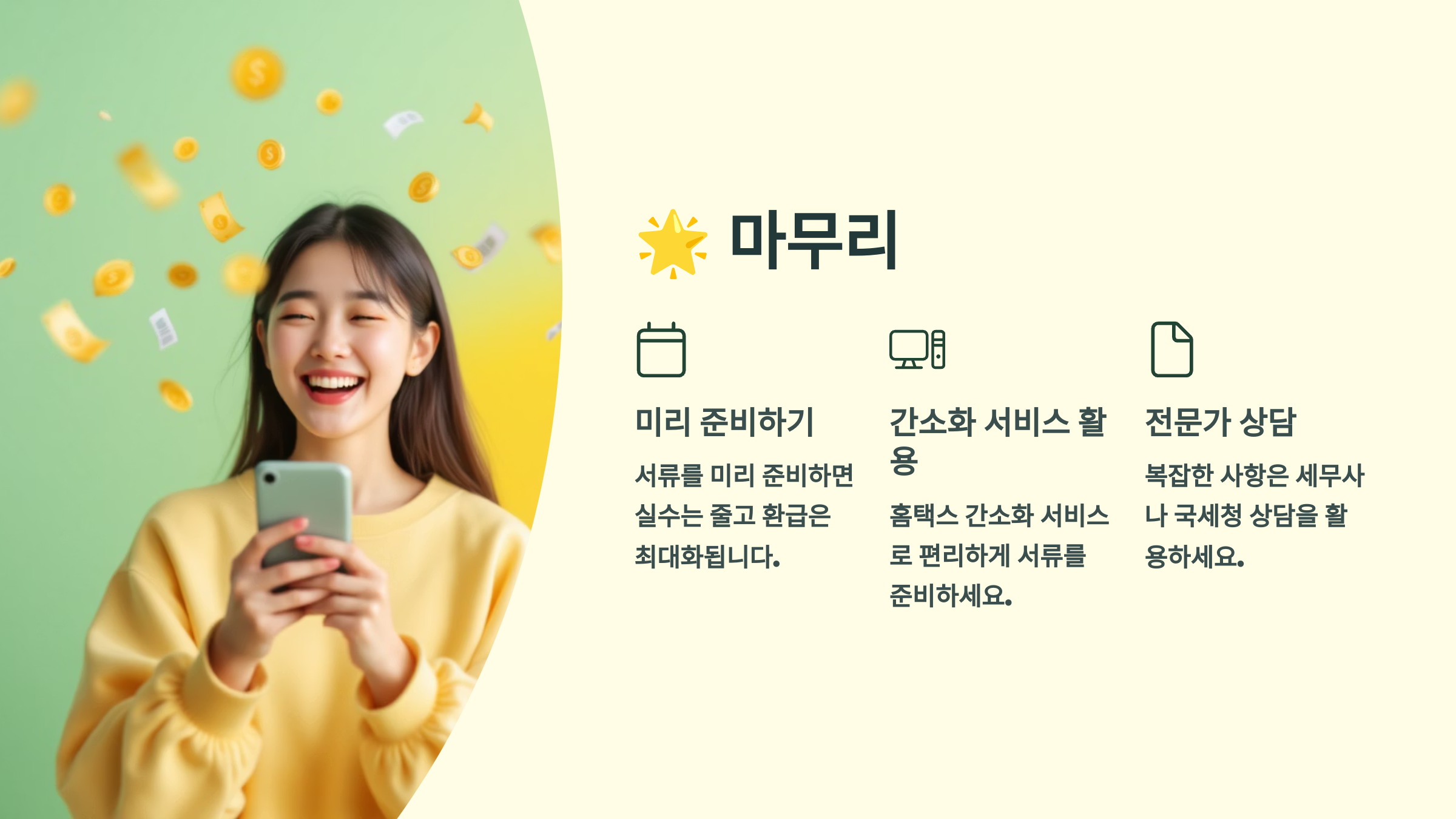 지금까지 연말정산 환급금을 최대화하기 위한 서류 정리법부터 주요 공제 항목, 똑똑한 소비 전략, 그리고 맞벌이 부부와 특별 케이스를 위한 팁까지 다양하게 살펴보았어요. 국세청 홈택스 간소화 서비스는 물론, 직접 챙겨야 할 서류들을 미리미리 준비하고, 놓치기 쉬운 숨은 공제들을 꼼꼼히 확인하는 것이 중요하답니다. 또한, 제출 후에도 원천징수영수증을 확인하고 필요하다면 경정청구를 활용하는 것도 잊지 마세요.
