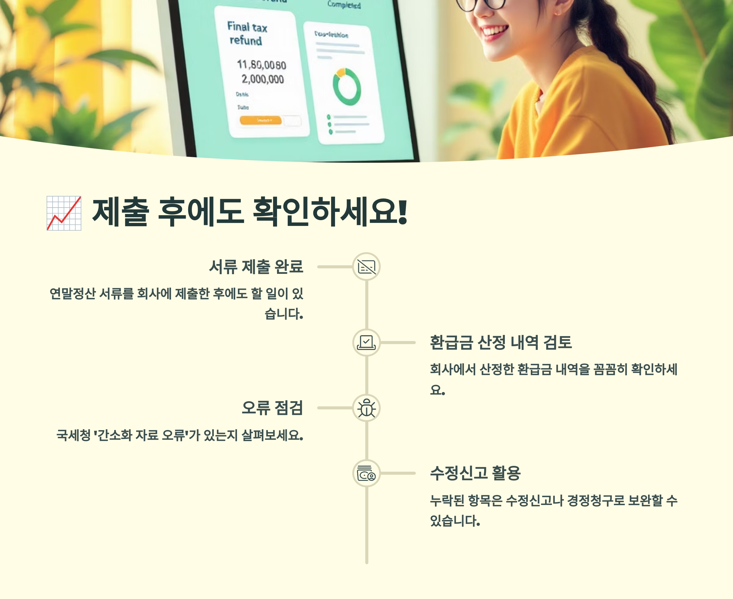 연말정산은 단 한 번의 신고로 끝나는 것이 아니라, 제출 후에도 꾸준히 확인하고 관리해야 하는 과정이에요. 이렇게 사후 관리까지 꼼꼼하게 진행하면, 내가 받을 수 있는 모든 환급금을 놓치지 않고 최대한으로 돌려받을 수 있을 거예요. 작은 관심이 큰 돈을 벌어다 줄 수 있다는 사실을 잊지 마세요!